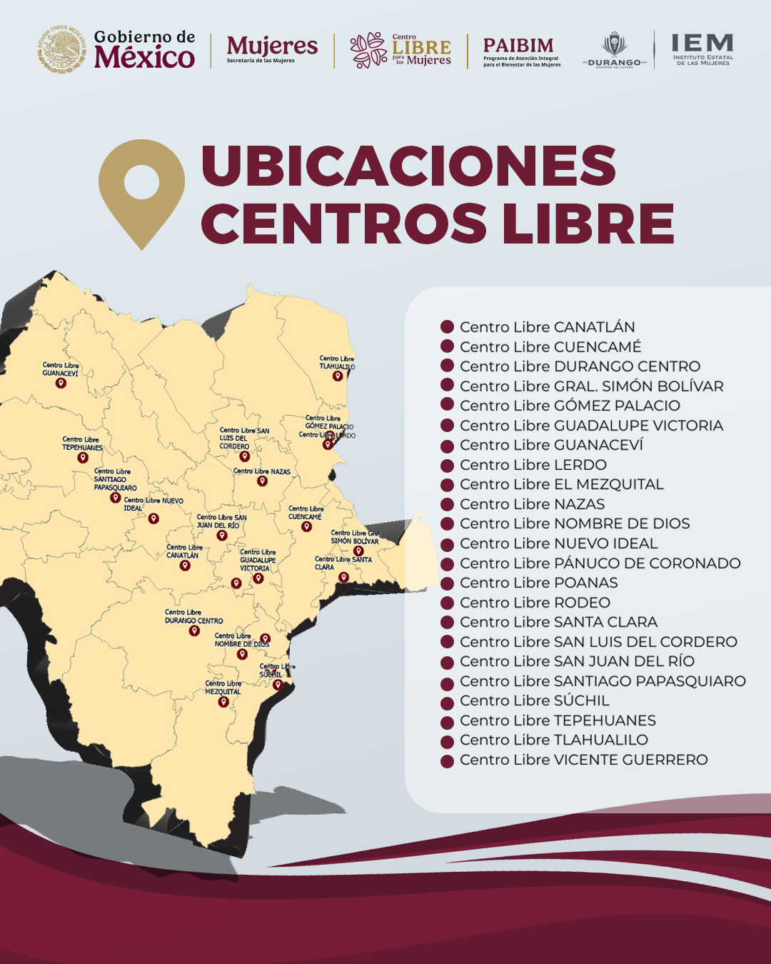 | SAN LUIS DEL CORDERO | AV. HIDALGO S/N COL. CENTRO C.P. 35740 | Lunes a Viernes de 9:00 a.m a 3:00 p.m | Ubicación |